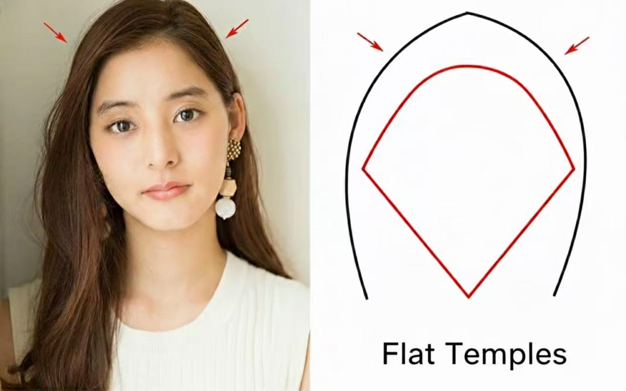 Increasing forehead exposure isn't enough. We must fill the sunken temples to create an "inverted triangle" (wide top, narrow bottom) illusion.